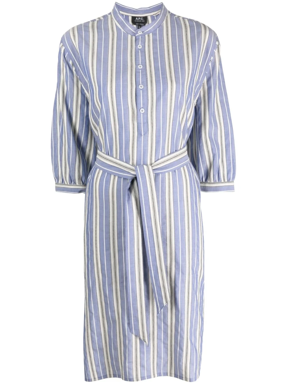 striped cotton shirt dress Highlights - Blue/white - Cotton - Vertical stripe pattern - Band collar - Half-length sleeves - Tied waist - Front button fastening - Knee-length Imported Composition Cotton 100% SIZE & FIT Model measurements Height 5 ft 10 in(1.77 m) Bust/Chest 32.67 in(83 cm) Hips 35.43 in(90 cm) Waist 23.62 in(60 cm) Measurement HIPS 40.15 in(102 cm) LENGTH 40.55 in(103 cm) WAIST 40.15 in(102 cm) FittingInformation Designed to be unstructured, offering a loose fit throughout The adjustable tie waist gives a more adaptable and personalised fit Made from a midweight non-stretch fabric This piece fits true to size – take your usual size Washing instructions Machine Wash