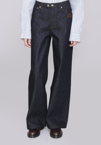 A.P.C. x Marc Jacobs interaction jeans. - Japanese raw denim. - High waist. - Hip hugging. - Straight and flared legs. - 70's cut. - THE JEAN A.P.C. Marc Jacobs embroidery under left front pocket. - Zipped fly. - Double buttoning with the heads of Jean Touitou and Marc Jacbos in the spirit of an antique coin. - Caramel stitching. - Made from 100% organic cotton. Size Advice - Nadine is 175 cm tall and is wearing size 26. - This item runs true to size. We recommend that you select your usual size. Composition & Material - 100% cotton. - Japanese material. - Made in Vietnam. - Do not dry clean. - Machine wash cold (30°C) inside-out. - Gentle spin cycle. - Do not tumble dry. - The jeans may appear shrunken after washing but they return to their original shape when worn.