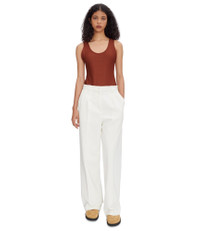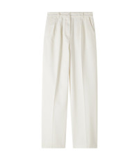 - High rise. - Wide leg. Permanent creases front and back. - Pleats below belt loops. - Zip fly. - Contains 25% cotton from organic farming and 25% recycled cotton. - May be worn with Tina overshirt. Size Advice - Honey is 5'7 tall and is wearing size 36. Composition & Material - 100% Cotton. - Spanish material. - Made in Tunisia. - Machine wash cold 65-85˚ F inside-out. Our commitments Through its RESPECT program A.P.C reduces (by implementing many practical measures to improve its environmental footprint) regulates (by respecting and enforcing its ethical responsibility on the part of its employees as well as its suppliers) and reuses (through its recycling vintage or quilts and butler programs for example).
