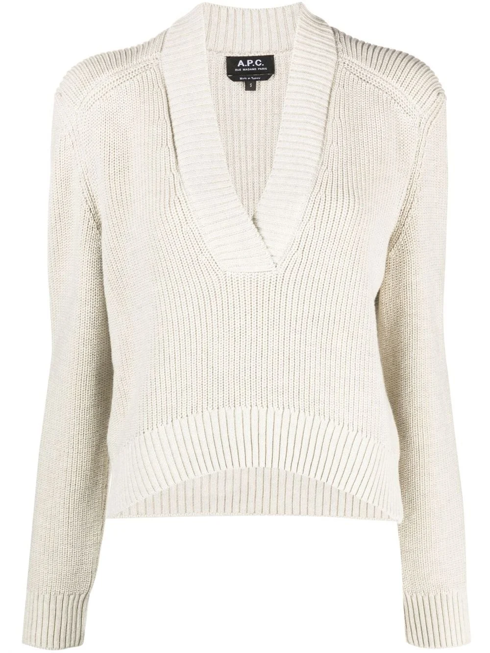 V-neck cotton jumper A.P.C. takes a minimal approach with this jumper for the AW23 collection. Imagined in muted beige, the cotton-made silhouette is enhanced with a deep V-neck, whilst wide ribbed trims frame the design. Highlights - Light beige - Cotton - Knitted construction - V-neck - Ribbed edge - Long sleeves - Ribbed cuffs and hem - Straight hem Imported Composition Cotton 100% SIZE & FIT Model measurements Height 5 ft 11 in(1.8 m) Bust/Chest 31.49 in(80 cm) Hips 36.22 in(92 cm) Waist 25.59 in(65 cm) FittingInformation Designed for a relaxed fit, this piece allows for comfort and movement when worn Made with a midweight knit, this piece offers some stretch