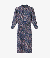 - Luminous flowing material. - Straight cut. - Ankle length. - Button-down collar. - Mother-of-pearl button opening. - Removable belt. - Exclusive A.P.C. motif. Size Advice - Ireen is 5'10 tall and is wearing size 36. Composition & Material - 100% viscose. - Italian material. - Made in Tunisia. - Dry clean only.