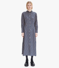 A.P.C. Women's dress. - Luminous flowing material. - Straight cut. - Ankle length. - Button-down collar. - Mother-of-pearl button opening. - Removable belt. - Exclusive A.P.C. motif. - Styles in the same fabric: Gabrielle shirt Size Advice - Ireen is 5'10 tall and is wearing size 36. Composition & Material - 100% viscose. - Italian material. - Made in Tunisia. - Dry clean only.