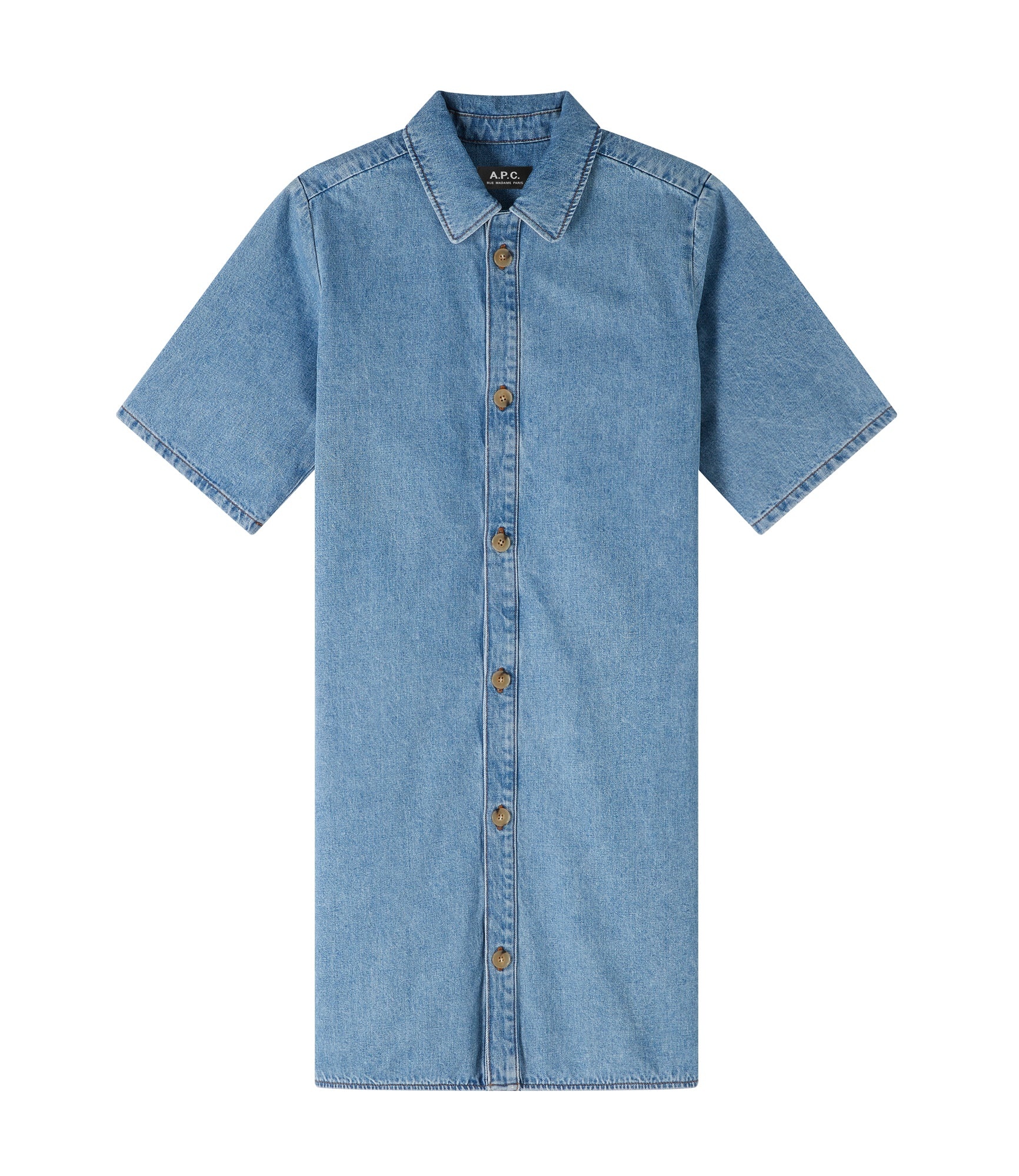 - Japanese material. - Straight cut. - Classic collar. - Buttons in faux horn. - Side slits. - Contains 30% cotton recycled from previous collections. Size Advice - Grace is 5'8 tall and is wearing size 36. Composition & Material - 100% Cotton. - Japanese material. - Made in Vietnam. - Machine wash cold 65-85˚ F inside-out. Our commitments Through its RESPECT program A.P.C reduces (by implementing many practical measures to improve its environmental footprint) regulates (by respecting and enforcing its ethical responsibility on the part of its employees as well as its suppliers) and reuses (through its recycling vintage or quilts and butler programs for example).
