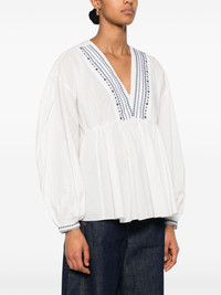 Vera blouse Highlights - White - Buttoned-cuff sleeves - V-neck - Embroidered motif Imported Composition Cotton 100% SIZE & FIT Model measurements Height 5 ft 10 in(1.77 m) Bust/Chest 33.07 in(84 cm) Hips 37 in(94 cm) Waist 24.8 in(63 cm) FittingInformation Designed for a relaxed fit, this piece allows for comfort and movement when worn Made from a lightweight non-stretch fabric