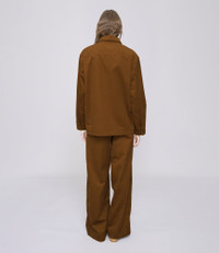 - Structured material. - Long loose cut. - Mid-rise. - Permanent crease on the front and back. - Two side pockets and one back pocket. - Hidden buttoning. Size Advice - Nadine is 5'9 tall and is wearing size 36. Composition & Material - 100% cotton. - Italian material. - Made in Tunisia. - Machine wash cold (86°F) inside-out.