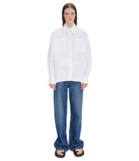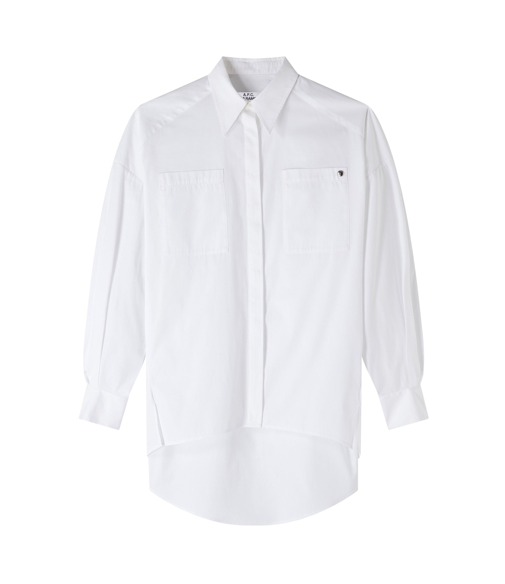 - Oversized cut. - Long and pointed classic collar. - Rounded hem with side slits. - Two chest pockets one with a silvertone metal rivet the signature of the line. - Hidden buttoning with first button visible. - Buttoned cuffs. - Mother-of-pearl buttons. - Box pleat on the back. - 100% cotton derived from organic farming. Size Advice - Grace is 5'10 tall and is wearing size 36. - This item sizes normally. We recommend that you select your usual size. Composition & Material - 100% cotton. - Italian material. - Made in Tunisia. - Machine wash cold (86°F) inside-out. Our commitments Through its RESPECT program A.P.C reduces (by implementing many practical measures to improve its environmental footprint) regulates (by respecting and enforcing its ethical responsibility on the part of its employees as well as its suppliers) and reuses (through its recycling vintage or quilts and butler programs for example).