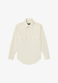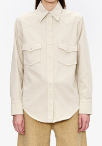 - Straight cut. - Classic collar. - Western-style yoke on the shoulders. - Two pockets with buttoned pointed flaps on the chest. - Mother-of-pearl snap buttons. - 82% organic cotton and 18% recycled cotton. Size Advice - Jeanne is 5'10 tall and is wearing size 36. Composition & Material - 100% cotton. - Spanish material. - Made in Tunisia. - Machine wash cold (86°F) inside-out.