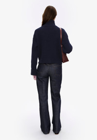 - Soft warm material. - Straight cut. - High trucker collar. - Sloping shoulders. - Wide ribbing on entire jumper. Size Advice - Jeanne is 5'10 tall and is wearing size S. Composition & Material - 90% wool. 10% cashmere. - Italian material. - Made in Romania. - Hand wash or delicate cycle.