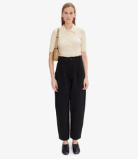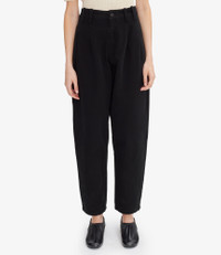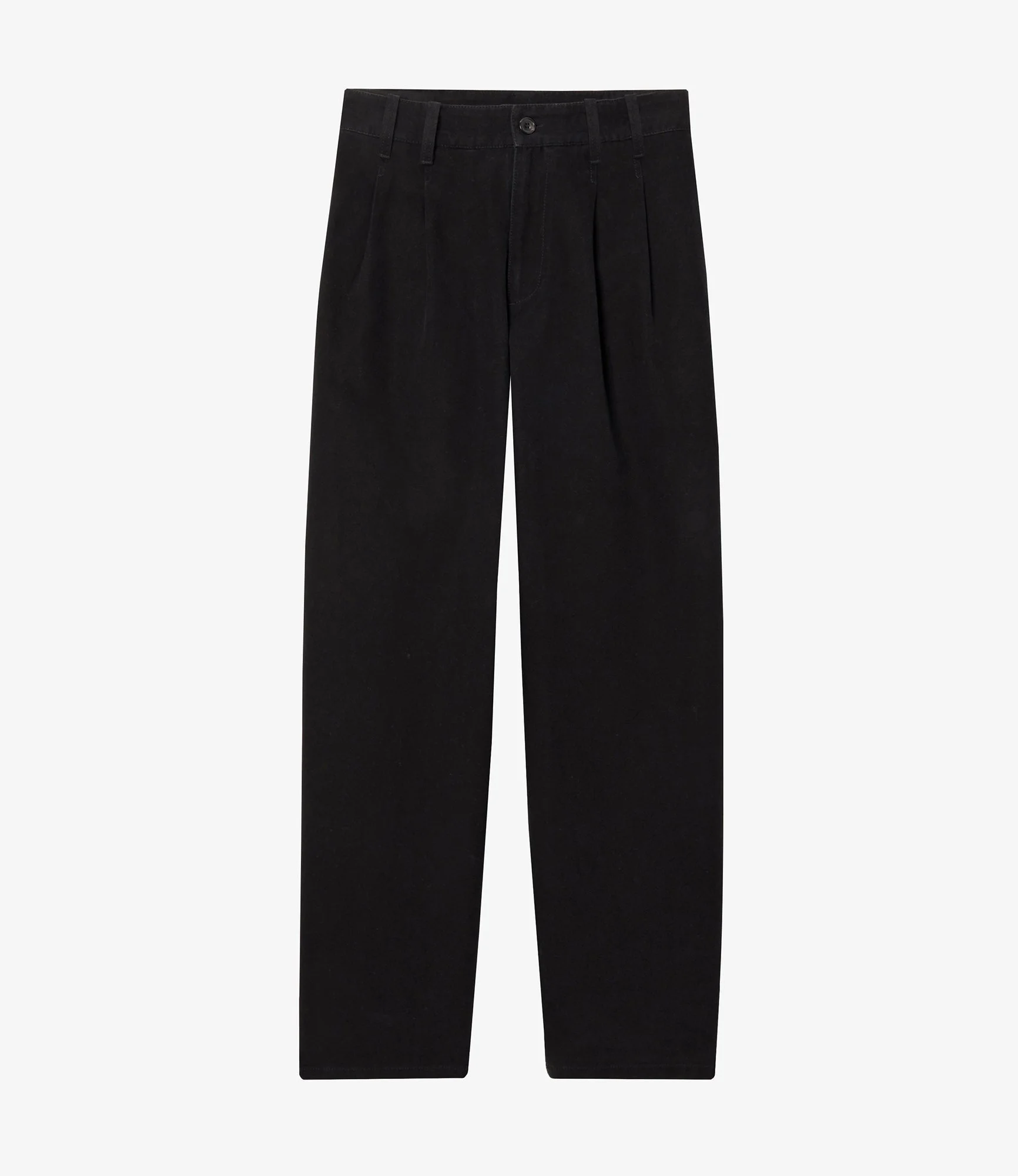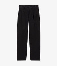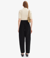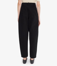 - Loose fit slimmer at the ankle. - Rather high waist. - Double pleats in front. - Two belt loops in front. - Faux horn button. - Wear with the Cally jacket. Size Advice - Kelsey is 5'10 tall and is wearing size 36. Composition & Material - 100% cotton. - Italian material. - Made in Tunisia. - Machine wash cold (86°F) inside-out.
