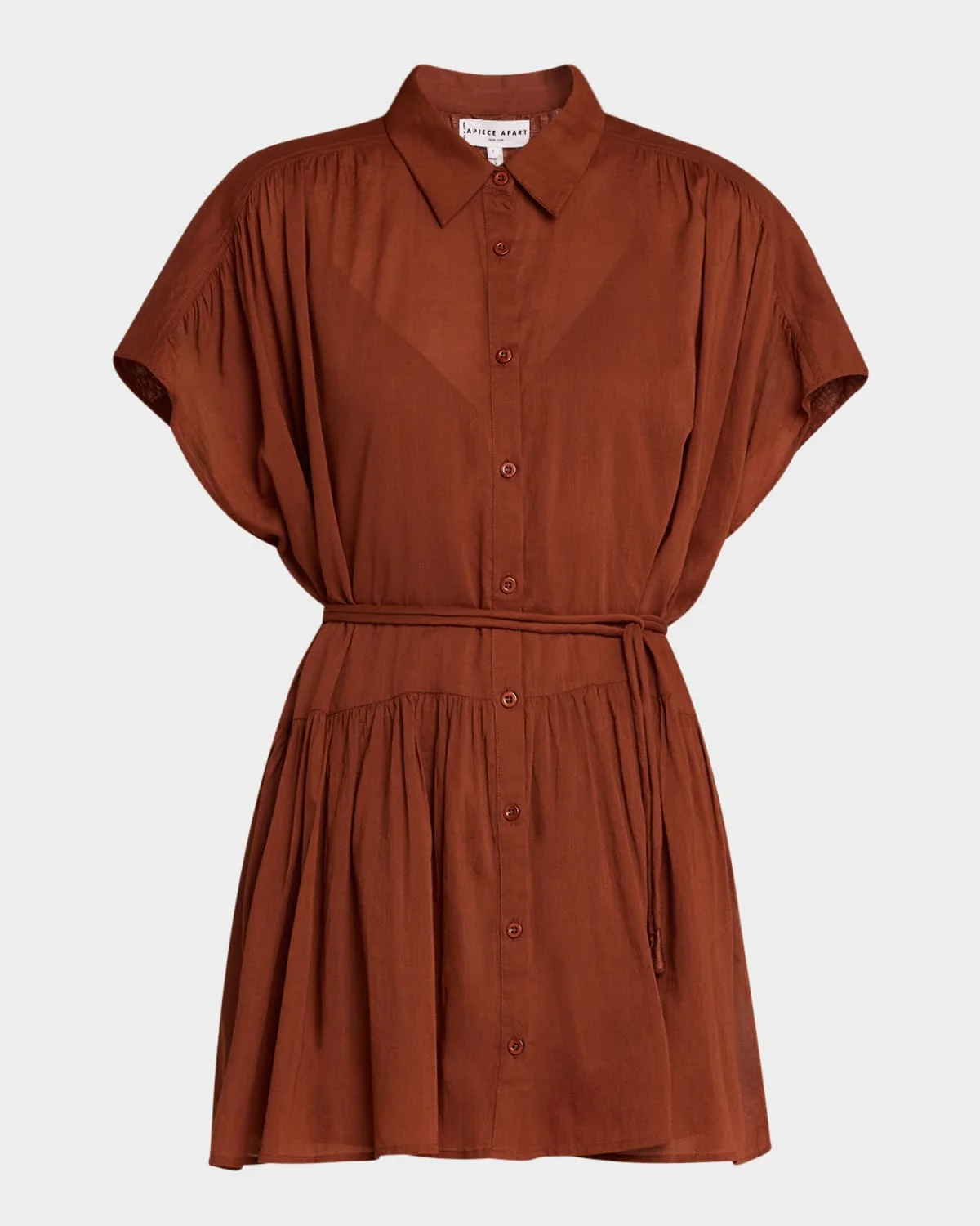 Apiece Apart "Agnezca" mini shirtdress in lightweight flowing organic cotton voile Point collar; button front Short sleeves Ruched back yoke Waist selftie Flounce ruffle hem Hem falls above the knee Aline silhouette Organic cotton Dry clean Imported