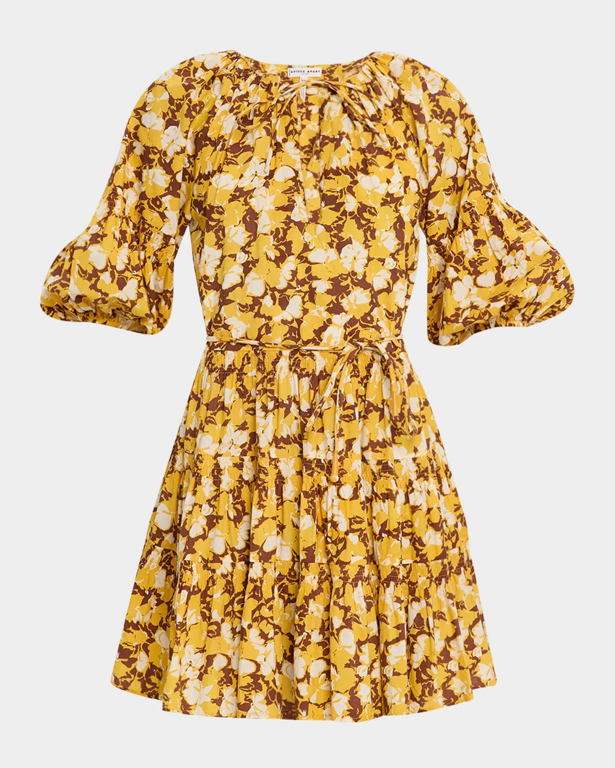 Apiece Apart "Cefalu" tiered mini dress in floralprint organic cotton voile with smocked details V neckline; front selftie 3/4 blouson sleeves Waist selftie Hem falls above the knee Aline silhouette Slipover style Organic cotton Hand wash or dry clean Imported