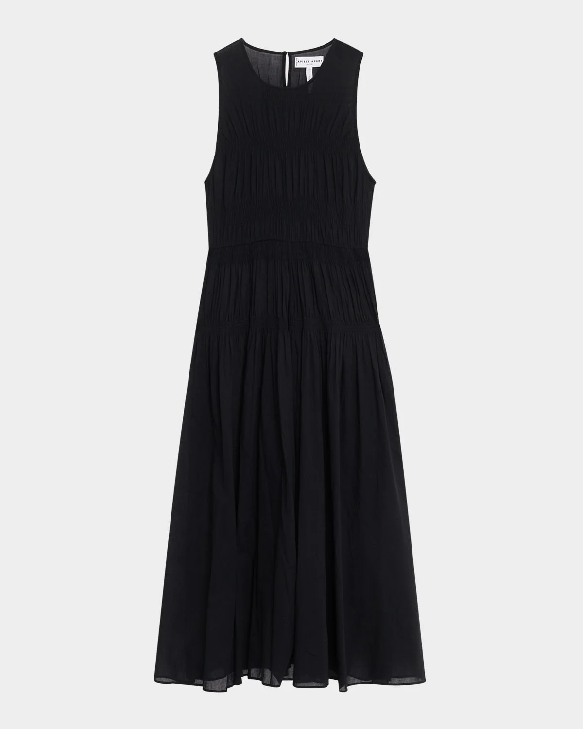Apiece Apart "Fabiana" shirred maxi dress in organic cotton voile Approx. 53.5"L from shoulders to hem Crew neckline Sleeveless Hem falls below the knee Aline silhouette Keyhole button back Slipover style Organic cotton Dry clean Imported