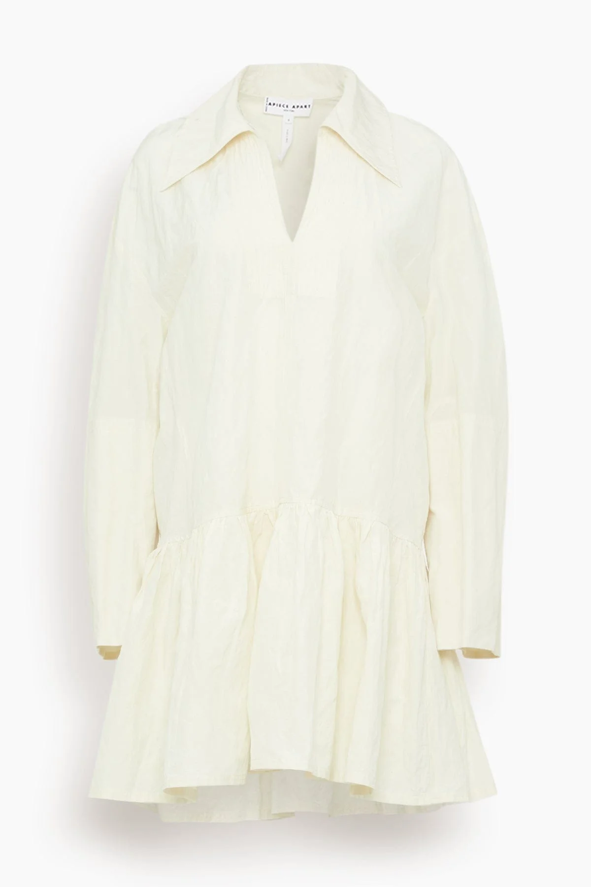 The Apiece Apart Romana Mini Dress in Cream is designed with a cool exaggerated collar and a flowy, relaxed fit and can be dressed up or down, all season long. - 57% Cotton 36% Viscose 7% Metallic - Made in China. Fabric imported from Italy - Drop waist, relaxed loose silhouette, shirt collar, deep slit at neckline, dropped shoulder - Dry clean only - Measurements from size S. Length: 34" - Oversized fit. Option to size down for a slimmer look