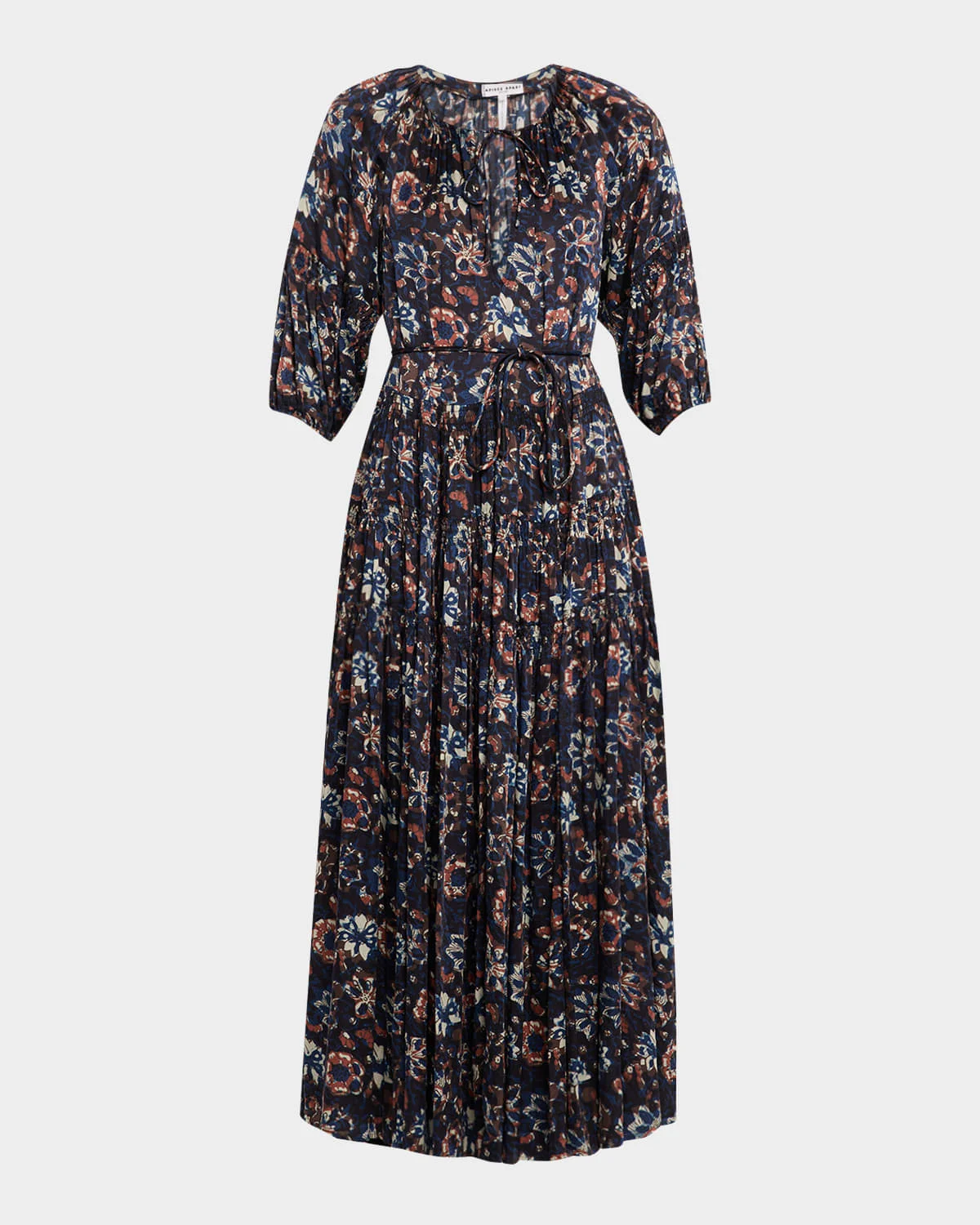 Apiece Apart "Santa Cecilia" tiered maxi dress in floralprint viscose sateen with smocked details Scoop neckline; cutout front selftie 3/4 raglan blouson sleeves Elasticized cuffs Waist selftie Ankle length Aline silhouette Slipover style Viscose Dry clean Imported