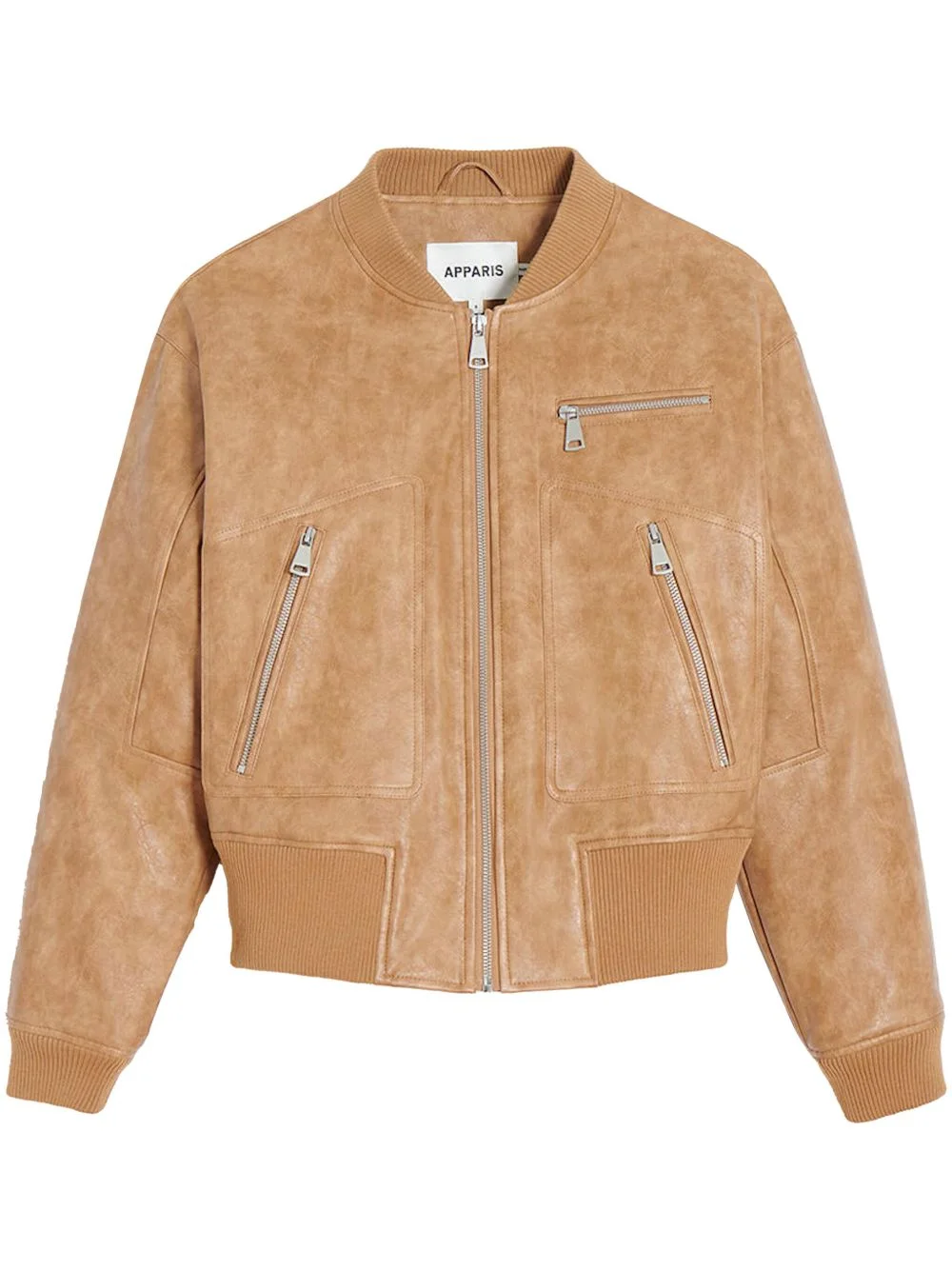 faux-leather bomber jacket Highlights - Light brown - Faux leather - Silver-tone hardware - Stand-up collar - Front zip fastening - Zip-fastening chest pocket - Two side zip-fastening pockets - Long sleeves - Ribbed cuffs and hem Imported Composition Artificial Leather 100% Washing instructions Dry Clean Only