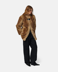 Faux mink fur coat with a SANS leather metal buckle. DETAILS & FIT Boxy fit. We recommend taking your normal size. Silver buckle closure, with hook and eye closure. Collarless. Slash pockets. APPARIS logo jacquard lining. Branded charm at back neck. Tonal faux leather interior facings. Length: 30 inches. MATERIALS Recycled faux mink fur with a SANS leather strap and silver buckle closure. GRS certified. 100% recycled polyester. To learn more about our approach to materials, click here.