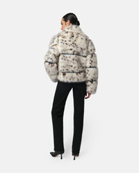 Snow leopard sable faux fur tiered short coat. DETAILS & FIT True to size. We recommend taking your normal size. Model is 5'9" wearing a size small. Length: 23 inches. Faux leather panelling with a hook and eye closure. MATERIALS Recycled faux snow leopard sable fur with SANS Leather paneling & 100% recycled lining. GRS certified materials. 77% Acrylic, 14% Recycled Polyester, 9% Modacrylic To learn more about our approach to materials, click here.
