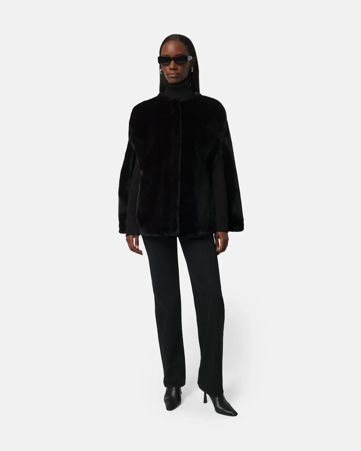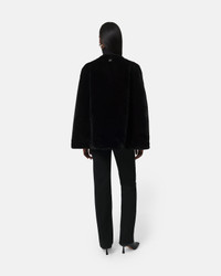 PLUCHE ™ cape with front facing armholes. DETAILS & FIT Regular fit. We recommend taking your normal size. Model is 5'8" wearing a size small. Length: 29 inches. Snap button closure. MATERIALS Recycled PLUCHE™ faux fur. Crafted from recycled polyester with a bonded faux suede tonal lining. GRS certified materials. Body: 100% Recycled Polyester. Lining: 50% Recycled Polyester, 50% Polyester. To learn more about our approach to materials, click here.