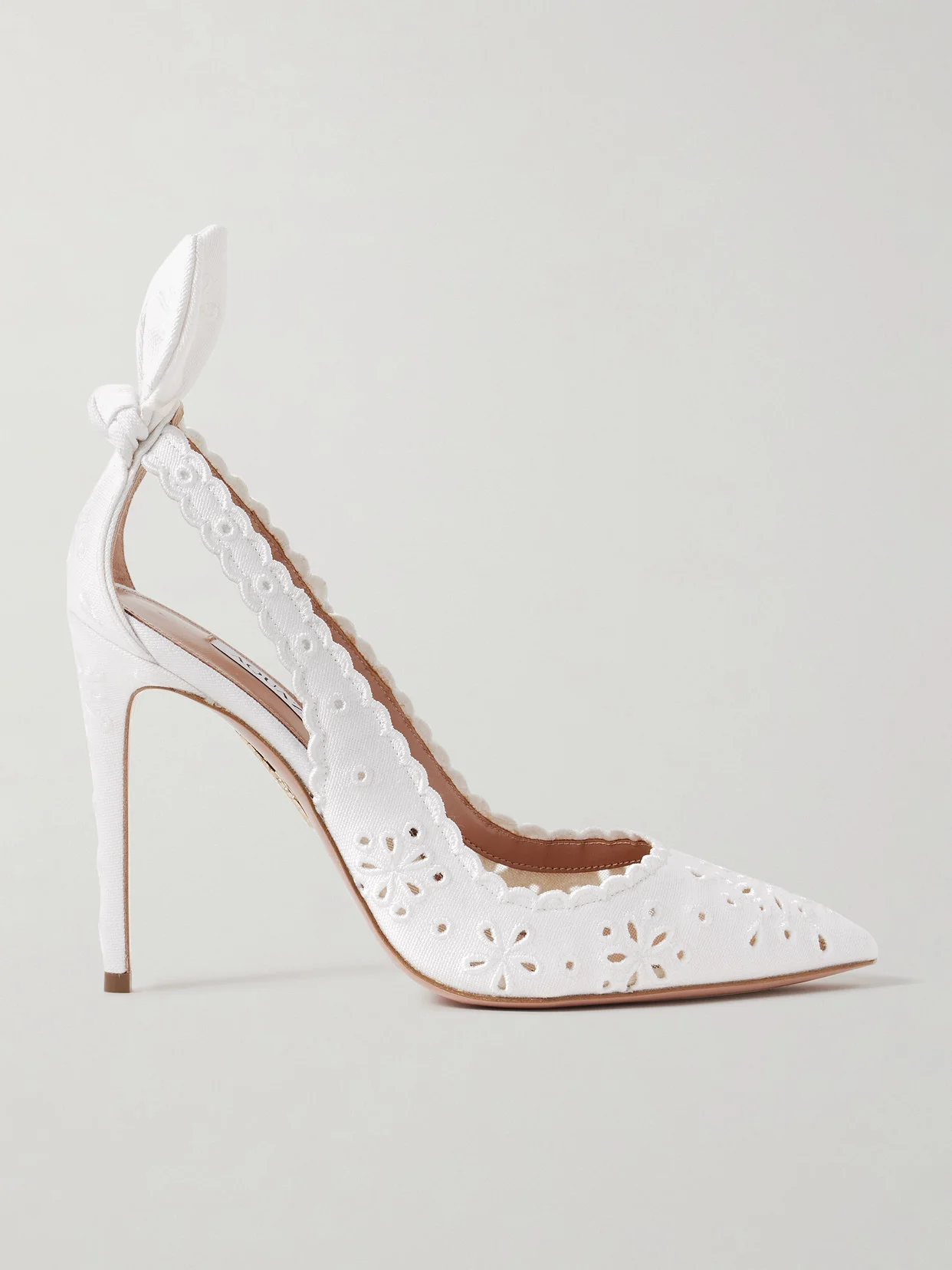 Aquazzura's pointy pumps are sure to add a touch of elegance to any outfit. Decorated with a dainty bow at each heel, they've been made in Italy from broderie anglaise canvas and have delicate scalloped trims.