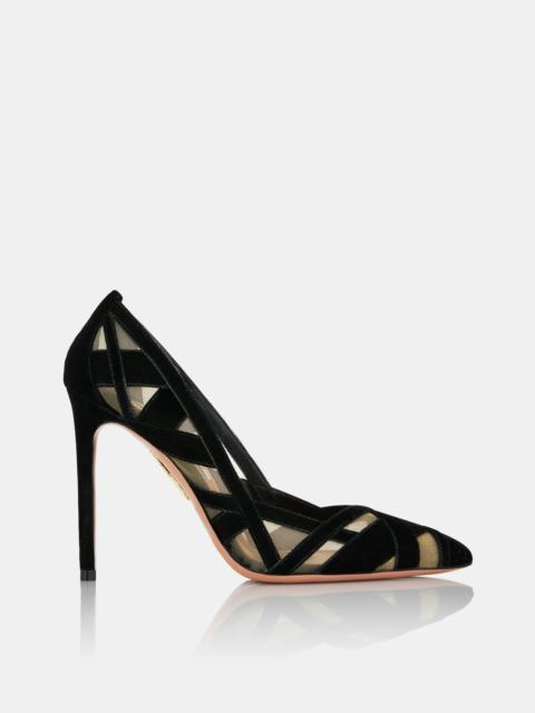 These Wrap Me Up Pumps make a stunning statement with their crisscrossing black velvet straps, creating an abstract cage effect over a sheer mesh base. Designed with classic pointed toes and 105 mm stiletto heels, look closely to catch a glimpse of the label's signature gold pineapple at the sole. Slip on Stiletto heel Padded leather insole Signature logo detailing Product: WMUHIGP0-VFM-000 Made in: ITALY