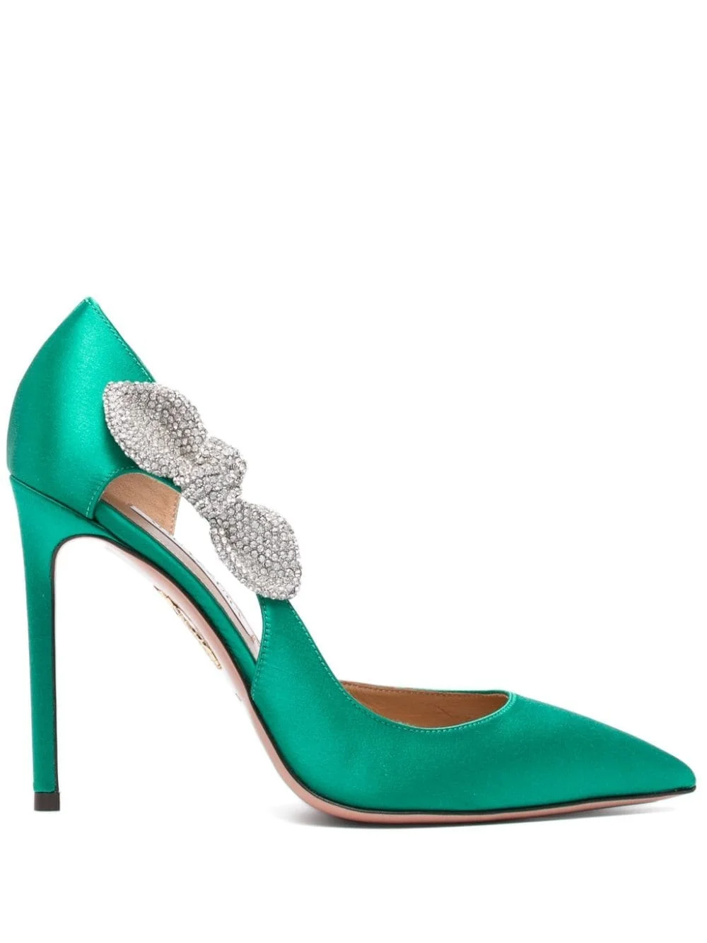 105mm Very Bow Tie Crystal pumps Highlights - Forest green - Satin weave - Slip-on style - 105mm - High stiletto heel - Bow detailing with glass crystal embellishment - Cut-out detailing - Pointed toe - Branded leather insole - Leather sole Made in Italy Composition Outer: Metal 100%, Fabric 100%, glass 100% Sole: Calf Leather 100% Lining: Calf Leather 100% SIZE & FIT Measurement HEEL 4.33 in(11 cm)