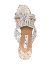75mm Gatsby mules Highlights - Silver-tone/gold-tone - Calf leather - 75mm stiletto heel - Interwoven strap detailing - Crystal embellishment - Almond open toe - Branded leather insole - Leather outsole Made in Italy Composition Outer: Calf Leather 100%, Metal 100% Sole: Calf Leather 100% Lining: Calf Leather 100% SIZE & FIT Measurement HEEL 3.14 in(8 cm) Sole height 0.39 in(1 cm)