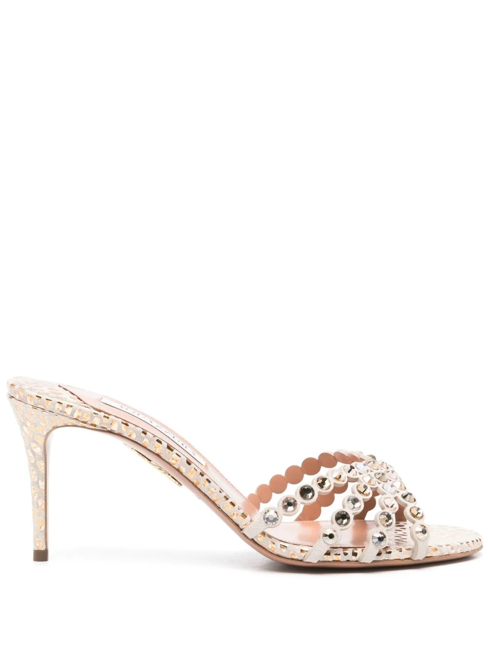 75mm Tequila sandals Highlights - Gold-tone - Branded leather insole - High stiletto heel - Almond open toe - Crystal embellishment Made in Italy Composition Lining: Leather 100% Outer: Calf Suede 100% Sole: Leather 100% SIZE & FIT Measurement HEEL 3.54 in(9 cm)