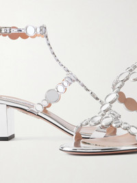Aquazzura's 'Afterglow' sandals are made from metallic leather with matching silver-tone embellishments that accent the curved straps. They've been crafted in Italy and have block heels that are comfortable enough for long events. Small to size. See Size & Fit notes.
