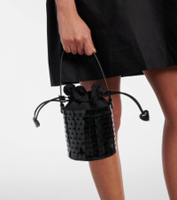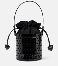 Crafted in Italy, the Amorouse bucket bag from Aquazzura features a heart-shaped pattern all over. It has a drawstring at the top for closure. Product Details - Material: fabric - Lining: fabric - Made in Italy - Designer color name: Black/Light Gold - Item color: black - Trim: leather - Closure: drawstring top - Top handle - Item number: P01020754 Size & Fit - Height 13/19cm-5/7.5" - Width 13cm-5" - Depth 13cm-5" - Length of handle 39cm-15.5"