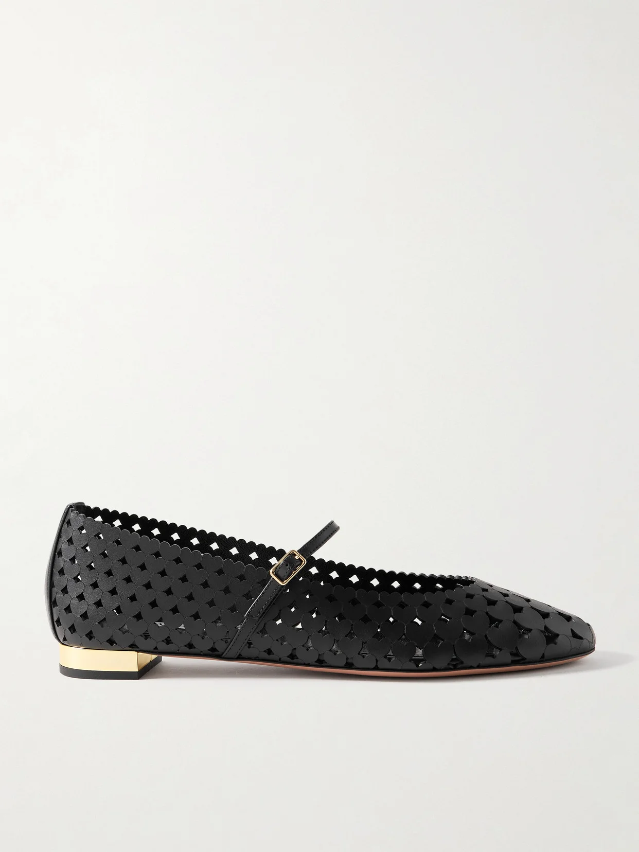 A closer look at Aquazzura's 'Amourose' flats reveals the precise cutouts create recurring heart motifs throughout. They're made from black leather and have gold-tone heels that complement the buckled straps.