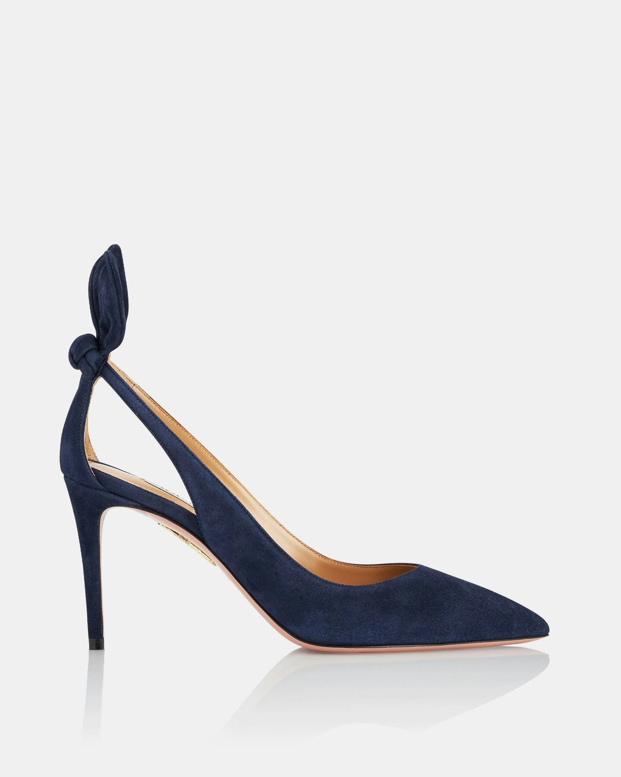Step out in elegant style in our coveted Bow Tie Pumps. Crafted in Italy from velvety suede in deep Midnight blue, this style features a pointed toe, skin-revealing side cutouts, and a flirty bow at the back for an extra touch of panache. The pair is finished on a mid heel for all-day comfort. Covered medium stiletto heel Leather lining Leather insole with Aquazzura Firenze stamped in gold Leather sole with embossed pineapple logo Product: DENMIDP0-SUE-MZN Made in: Italy