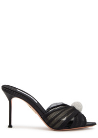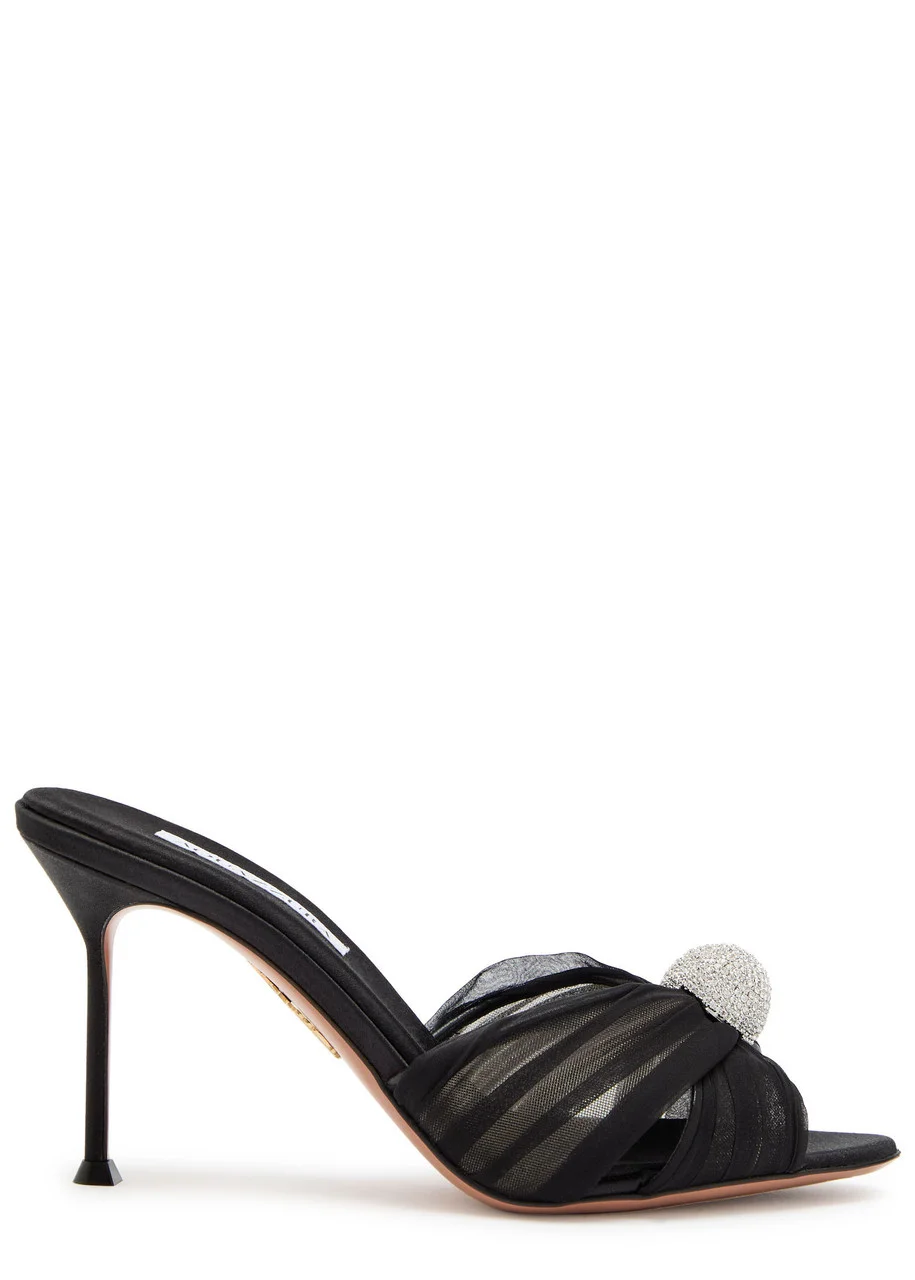 Info & Care Aquazurra;satin mules Heel measures approximately;3.25 inches/ 85mm Mesh cross-over straps with crystal embellishment, pointed toe Slip-on Size & Fit Only available in full sizes, go up to the nearest whole size if you take a half size