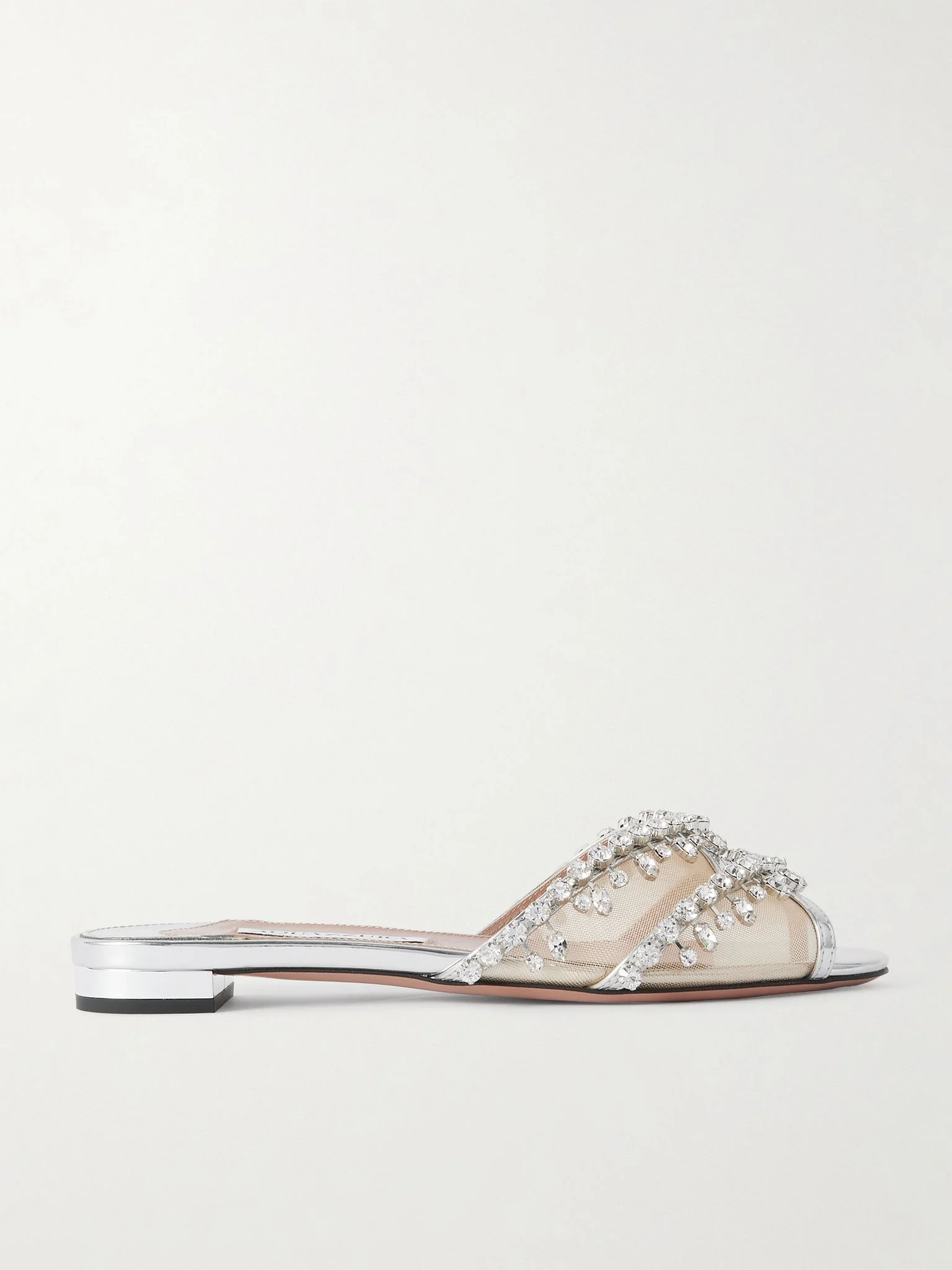 Temptation crystal-embellished mesh-trimmed metallic leather slides Silver