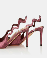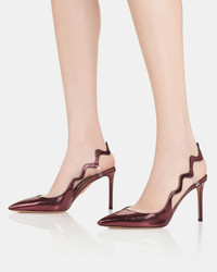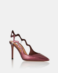 The Artiste Sling Pump puts a playful twist on the classic slingback silhouette with its undulating strap, designed to catch the eye from every angle and secured with discreet clear PVC inserts. Crafted from metallic snake-effect leather in a rich red wine hue, it features a flattering pointed toe and a slim stiletto heel for added sophistication. Slingback strap Mid heel Padded leather insole Signature logo detailing Product: ARTMIDL1-MKV-WIN Made in: ITALY