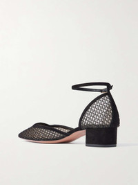EDITORS'NOTES Aquazzura's footwear is handcrafted in Florence with meticulous precision, so each shoe is a "small work of art". These 'Asha' pumps are made from black mesh and suede that accents the square vamps and block heels. Style them with dresses, tailoring and jeans alike. SIZE & FIT - Fits true to size, take your normal size - Italian sizing DETAILS & CARE - Heel measures approximately 35mm/ 1.5 inches - Black and gold mesh, black suede (Goat) - Buckle-fastening ankle strap