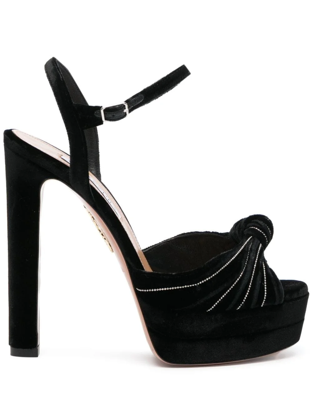 Atelier Plateau 130mm velvet pumps Highlights - Black - Velvet - Chain detailing - Knot detailing - Peep toe - Buckle-fastening ankle strap - Branded leather insole - 130mm tapered heel - Leather outsole Made in Italy Composition Cotton 100% SIZE & FIT Measurement HEEL 5.78 in(14.7 cm) PLATFORM 1.49 in(3.8 cm)