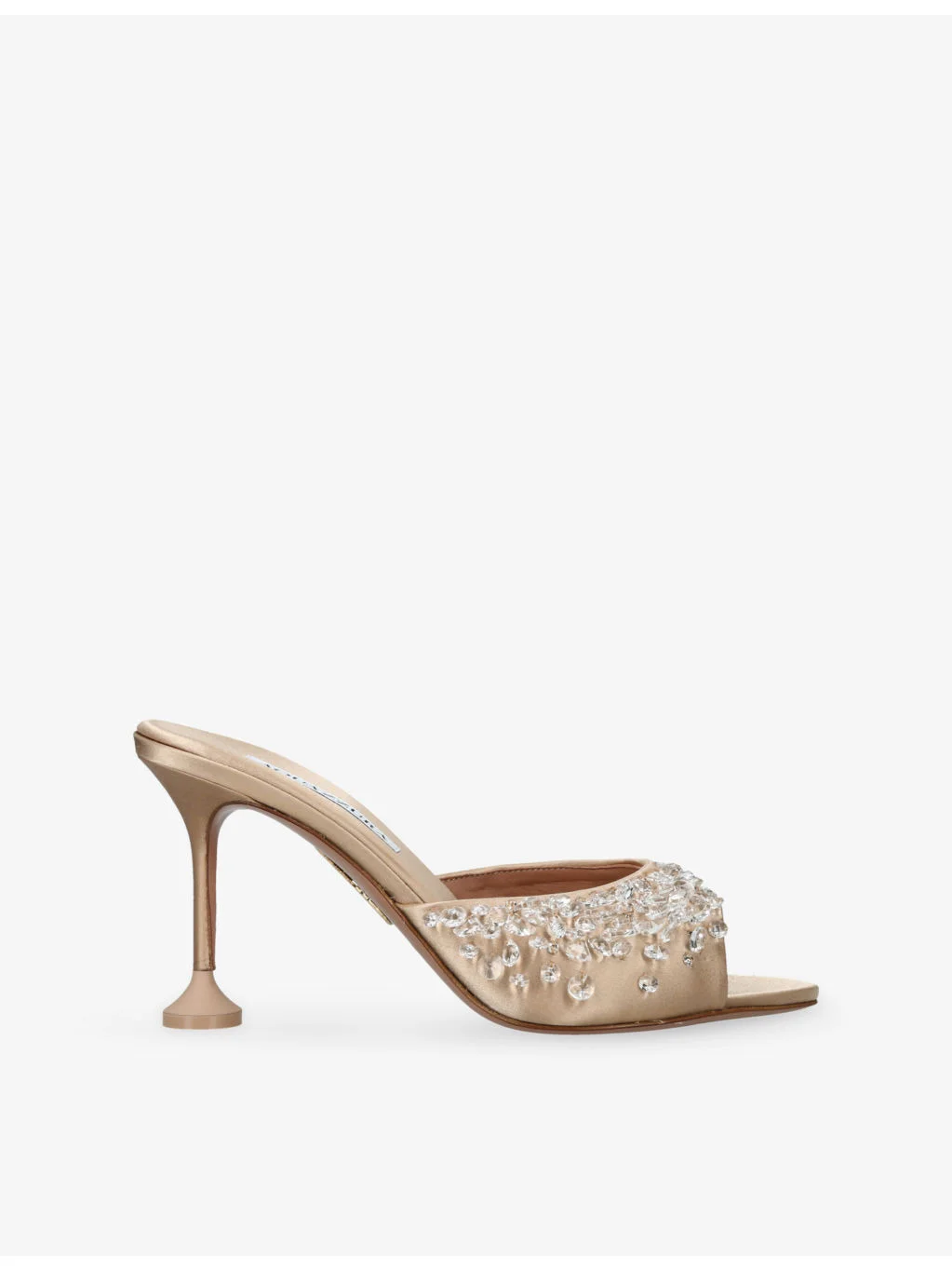 PRODUCT DETAILS - Aquazzura satin mules - 100% fabric - Pointed open toe, crystal-embellished upper, sculpted stiletto heel - Heel height 85mm / 3.34 inches - Wipe with a clean, dry cloth - Made in Italy - Upper: 100% fabric - Lining: 100% fabric - Sole: 100% leather Ref: R04563287