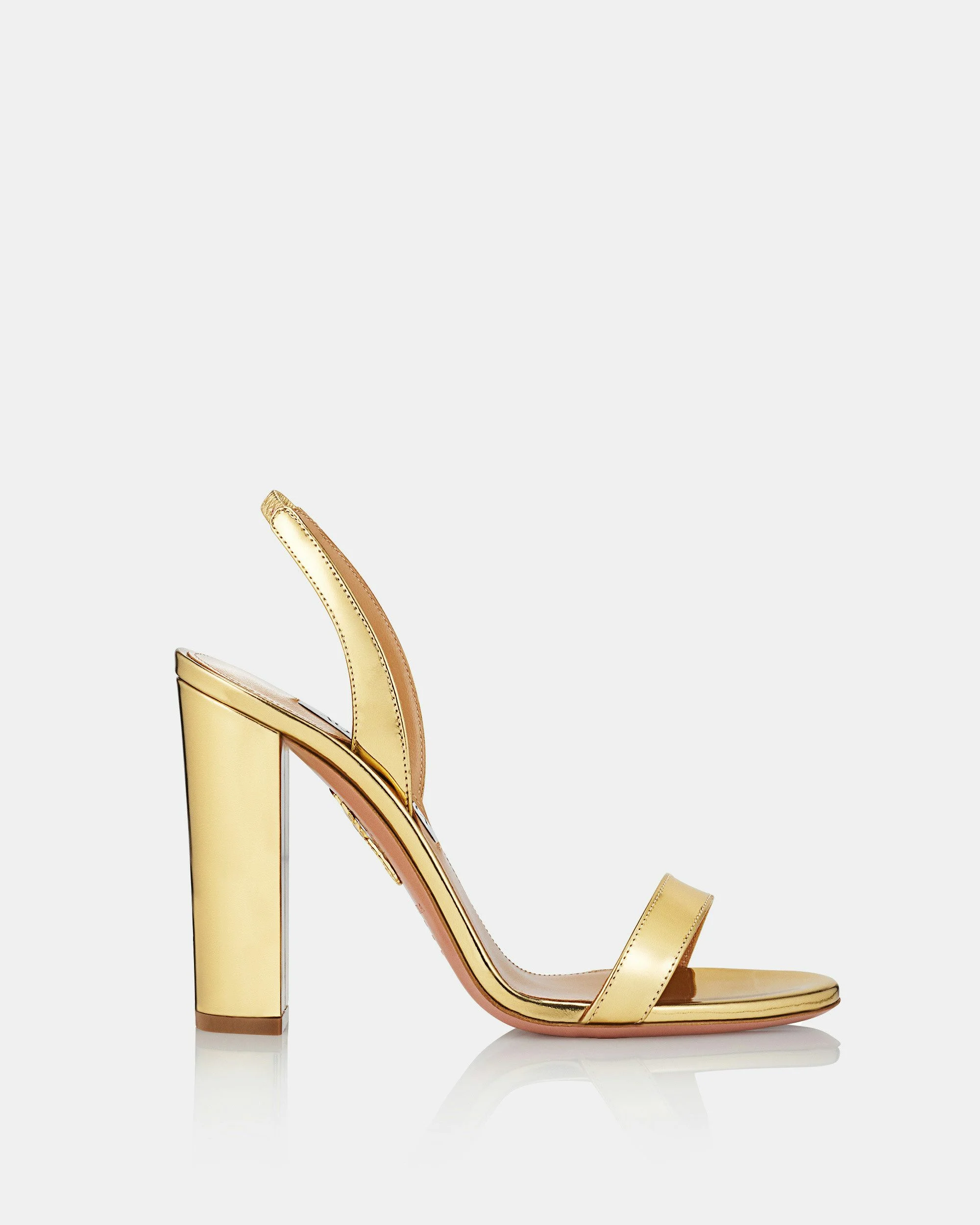 Our coveted So Nude silhouette is reimagined on a block heel. Italian-crafted from polished specchio in gleaming soft gold, the minimal design is fashioned with a slender strap that wraps the toes and a comfortable slingback that keeps the foot in place. The chunky heel gives you confidence for long evening walks. Covered block heel Open toe Slingback strap Leather insole with 'Aquazzura' label Product: SNBHIGS0-SPE-SOG Made in: Italy