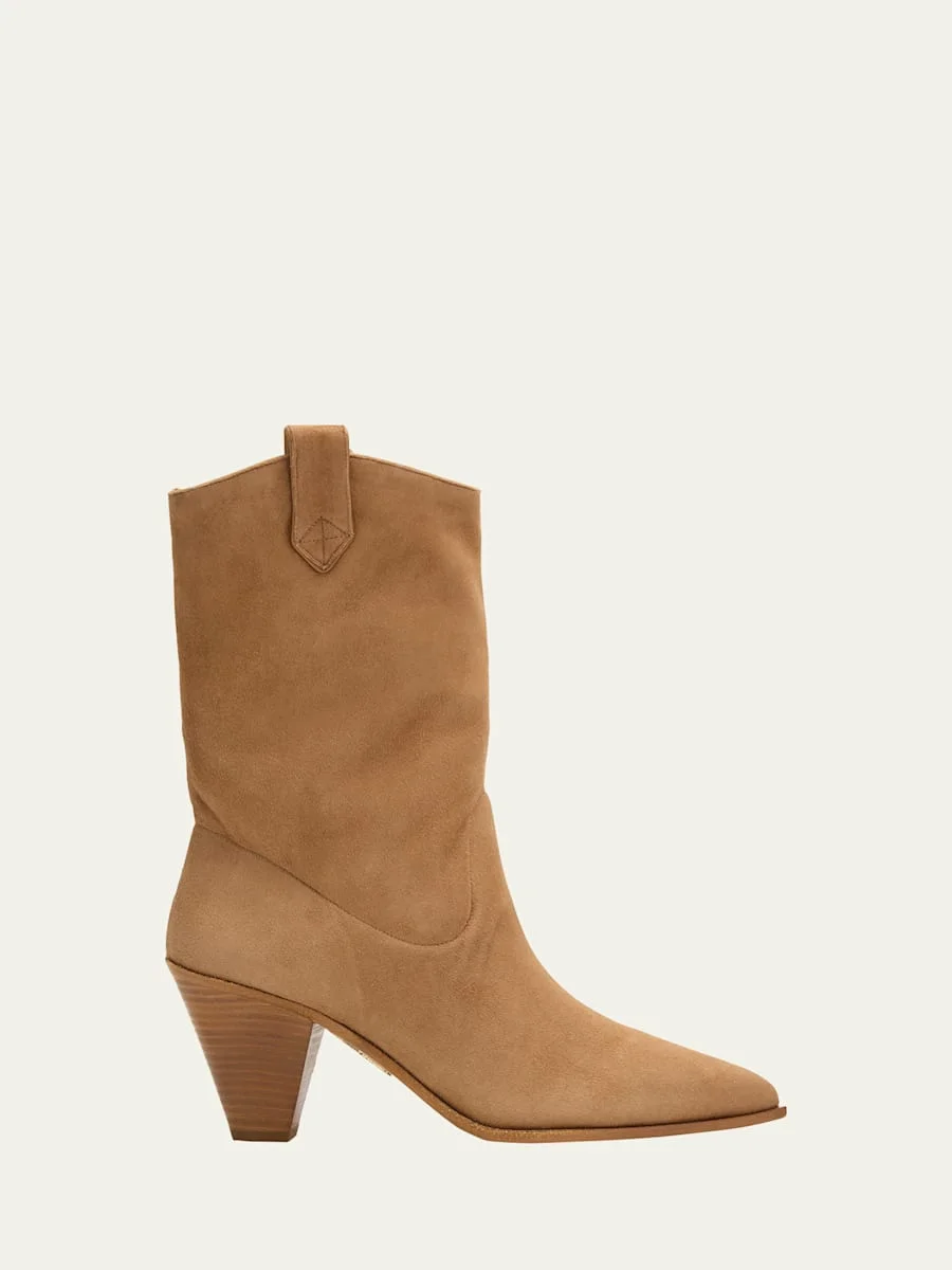 Aquazzura "Boogie" cowboy booties in supple suede 2.75 in / 70 mm wood block heel Pointed toe Pull-tabs at collar Pull-on style Goat leather lining Leather outsole Made in France Online Inquiries: BGS21_X6W1S| Store Inquiries: #5012566