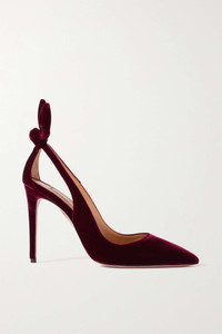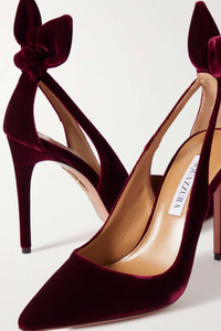 EDITORS'NOTES There's a timeless elegance to Aquazzura's 'Bow Tie' pumps that's earned them a place in the heart of royalty. This pair is crafted from plush velvet, set on spindly stiletto heels and fitted with cushioned insoles so they're unexpectedly comfortable. The cutout heel calls for a fresh pedicure. SIZE & FIT - Fits true to size, take your normal size - Italian sizing DETAILS & CARE - Heel measures approximately 105mm/ 4 inches - Burgundy velvet - Slip on - Designer color: Merlot