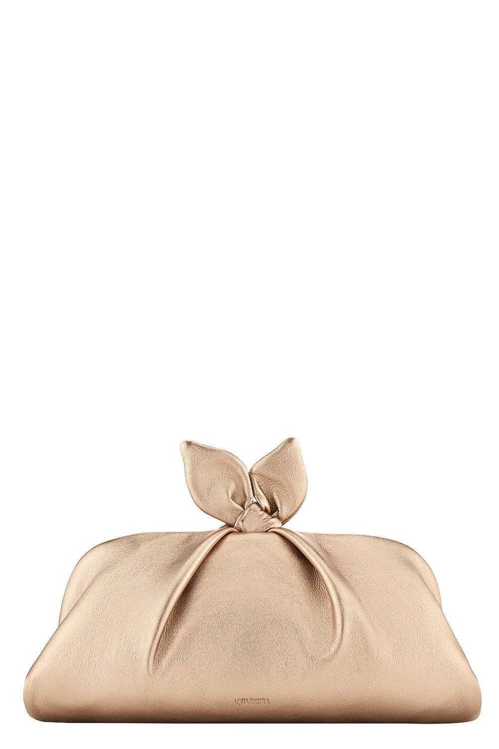 DETAILS AND INSIGHT Aquazzura bow tie clutch in light copper/gold. Nappa washed 25L x 12H x 9D cm Fits iPhone 16 Pro Max Made in Italy Style DENCLUC1-WNA-LCH