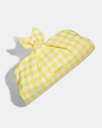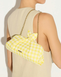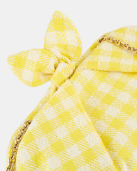 Adorned by a flirty knotted top, the Bow Tie Clutch returns in a bright Vichy motif that enhances its retro-chic feel. Crafted from jacquard fabric in Daisy yellow and white, it features a rigid clasp closure and a gold-tone logo plaque for a subtle yet precious finishing touch. Magnetic closure Chain strap Metal logo lettering Aquamarine dust bag Product: DENCLUC1-PJQ-DLG Dimensions: 25L x 12H x 9D cm Made in: ITALY