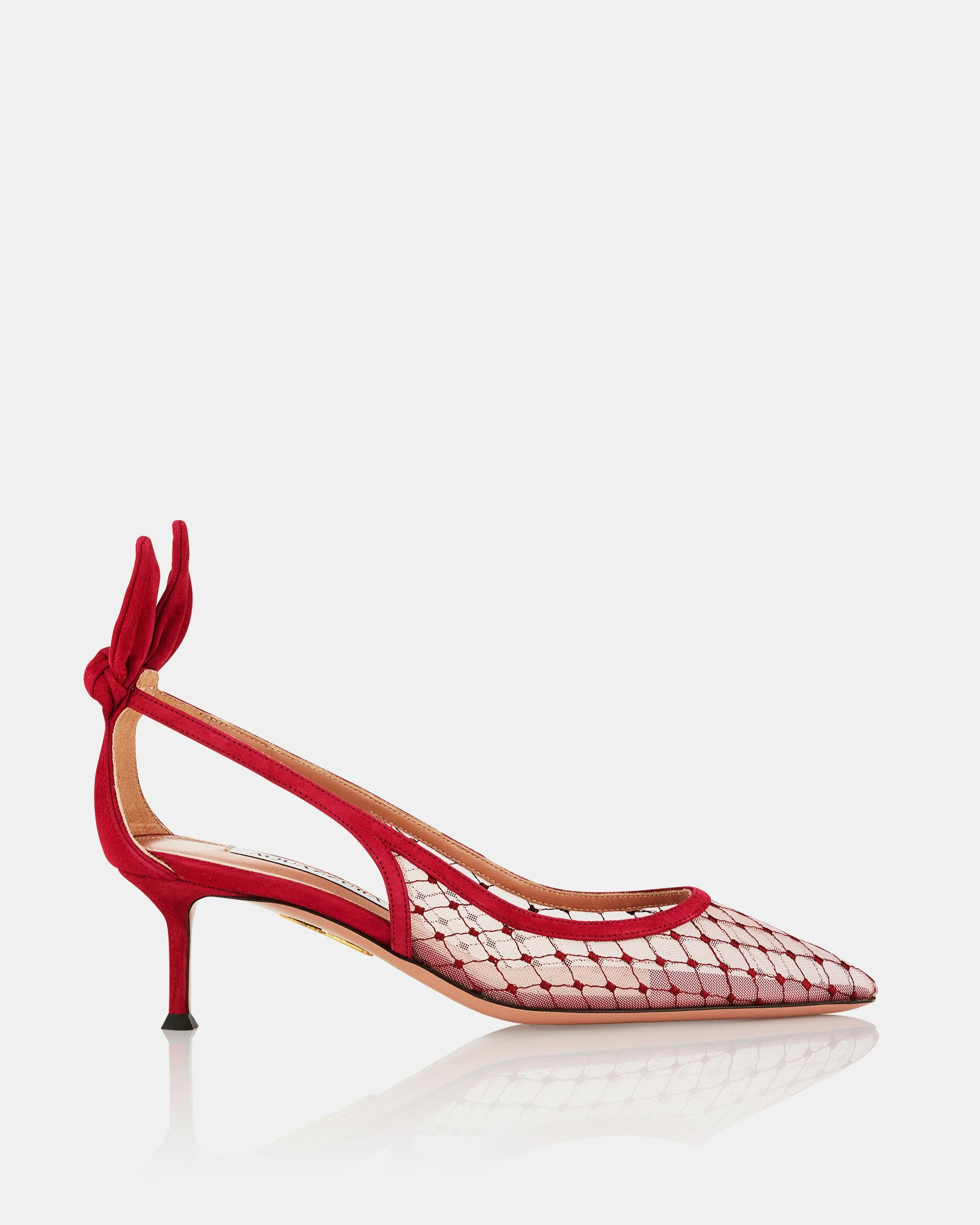 These Bow Tie Net Pumps are a pair you'll reach for time and time again, thanks to their classic pointed profile, manageable 50 mm kitten heels and Aquazzuras iconic bows at the back. Theyre crafted from sheer mesh and supple suede in a rich burgundy shade – as versatile and timeless as black or brown. Slip-on shoes Low heel Padded leather insole Signature logo detailing Product: DNNMIDP0-FMS-CD3 Made in: Italy