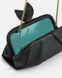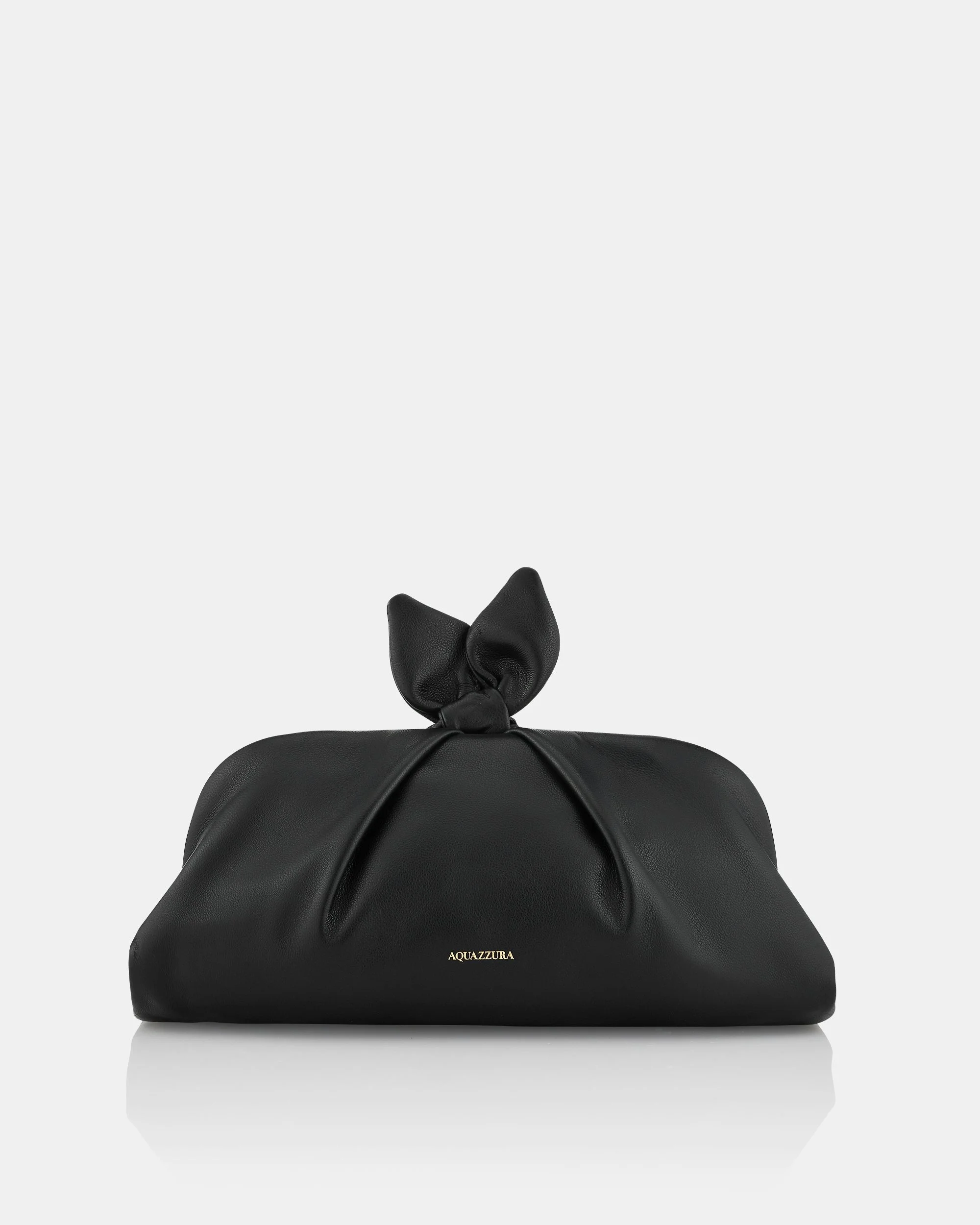 Inspired by the flirty bow motif that adorns Aquazzuras eponymous pumps, this Bow Tie Clutch is crafted from supple black nappa leather, softly folded and tied over a metal frame. A contemporary update to the classic rigid pouch, this compact bag is branded with a light gold tone lettering and a thin metal chain strap you can hide inside. Magnetic closure Chain strap Metal logo lettering Aquamarine dust bag Product: DENCLUC1-NAP-BLD Dimensions: 25L x 12H x 9D cm Made in: Italy