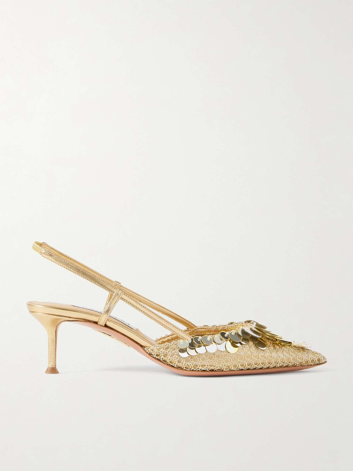 EDITORS'NOTES Aquazzura's pumps are inspired by the elaborate styles worn by 'Can Can' dancers. Made from beige tulle, they're overlaid with woven metallic leather and topped with matching pailettes and beads. The adjustable slingback straps ensures a comfortable fit. SIZE & FIT - Fits true to size, take your normal size - Italian sizing DETAILS & CARE - Heel measures approximately 50mm/ 2 inches - Gold leather, beige tulle - Buckle-fastening slingback strap