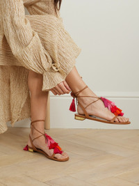 Aquazzura's 'Capri' sandals are the perfect way to elevate denim or a simple dress. Crafted from brown leather, they have playful tonal-pink, red and orange tassels along the front straps and wraparound ankle ties. Match your bracelets to the gold heel.