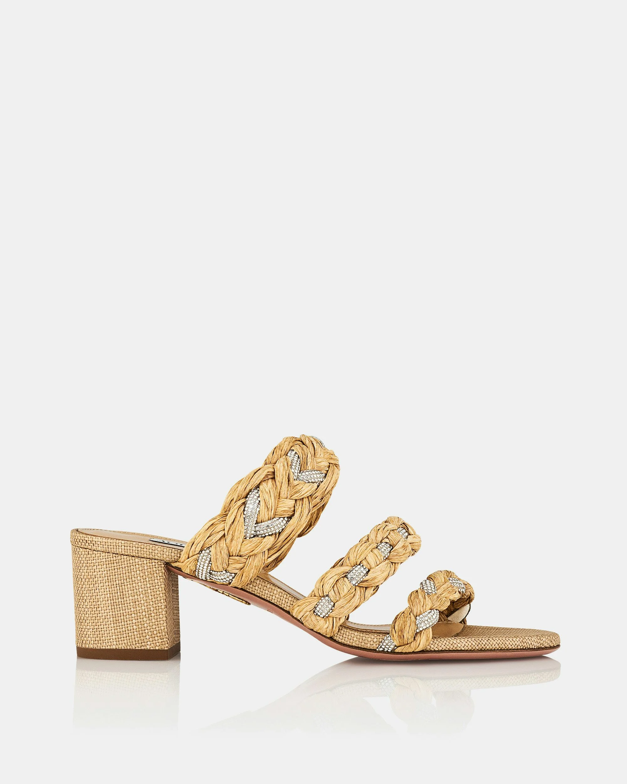 Effortless with a hint of extravagance – our Costiera Sandals are crafted from natural raffia and interwoven with luxurious crystal embellishments. The backless silhouette is secured with a trio of straps and set on a 50 mm block heel that adds lift without compromising comfort. Slip on Mid heel Crystal embellishments Padded leather insole Signature logo detailing Product: COTMIDS0-RFF-NAT Made in: Italy