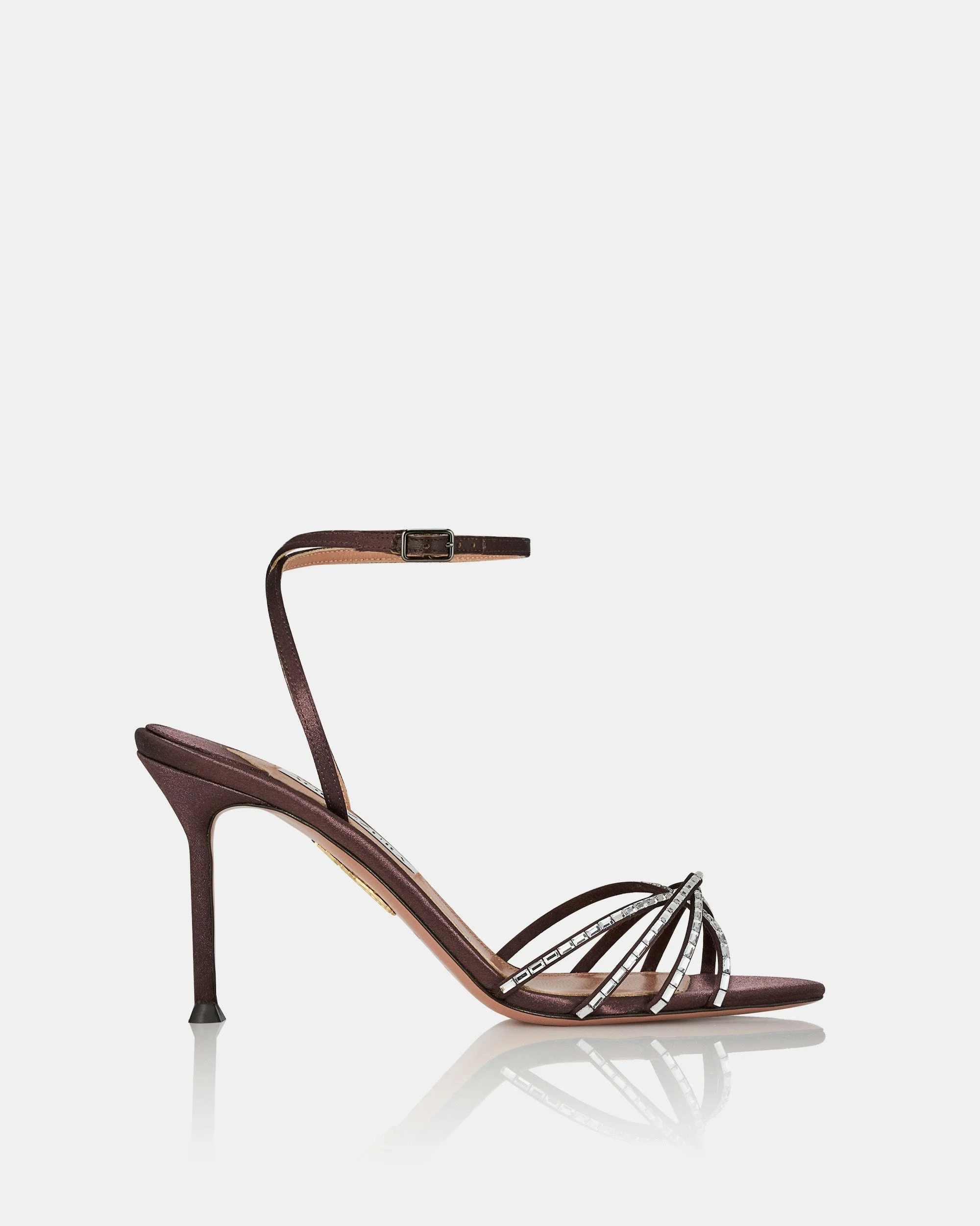 Where simplicity meets glamour: these Tell Me Crystal Sandals are crafted from slim strips of mocha-brown satin, adorned with dazzling gemstones that trace the caged design framing the toes. Set on slim 85 mm stiletto heels, they're lined and soled with leather for comfort. Adjustable buckle closure Mid heel Padded leather insole Signature logo detailing Product: TLCMIDS0-SAT-MHA Made in: ITALY