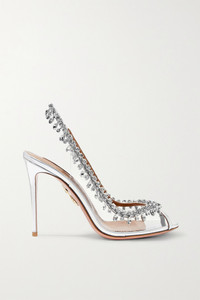 EDITORS'NOTES Aquazzura's 'Temptation' pumps are made from clear PVC and silver patent-leather in an elegant peep-toe silhouette that instantly makes legs appear longer. They're embellished with dangling crystals that frame and flatter your feet. Show them off with asymmetric hemlines. Shown here with: [Haider Ackermann Dress id914220], [Miu Miu Shoulder bag id918904], [Bottega Veneta Rings id573377]. SIZE & FIT - Fits small to size, take a full size larger than normal - Italian sizing DETAILS & CARE - Heel measures approximately 105mm/ 4 inches - Clear PVC, silver patent-leather (Calf) - Elasticated slingback strap - Made in Italy Small to size. See Size & Fit notes.