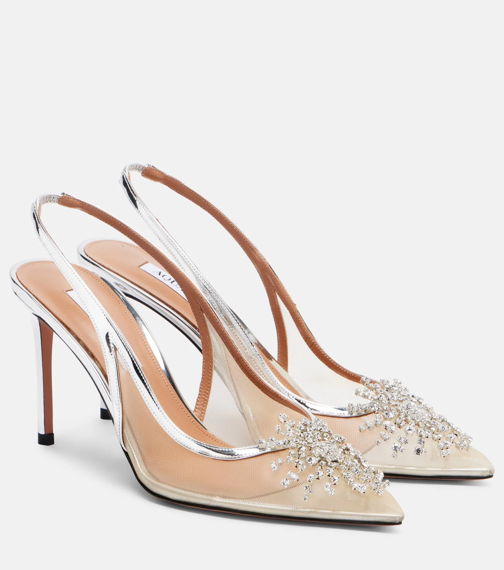 The Crystal Firework slingback pumps from Aquazzura add glamour to the ensemble with their crystal-embellished accents on the pointed-toe profiles. The pair is finished with mirrored leather trims and 85mm stiletto heels. Product Details - Upper: fabric, synthetic material - Lining: leather, fabric - Sole: leather insole and sole - Color: silver - Toe shape: pointed toe - Made in Italy - Includes: dust bag, shoe box - Designer color name: Silver - Trim: crystals, brass - Slingback strap - Item number: P01138036 Size & Fit - True to size - European sizes - 8,5cm-3.5" heel